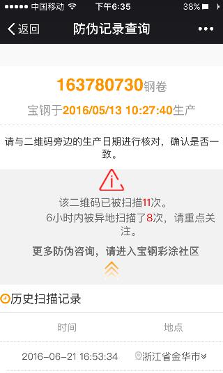 图中的二维码,就是我们接下来要说的重点了。钢板卷背面的二维码可以通过第三方的二维码扫描软件,或是微信扫一扫直接扫描。扫出来的内容会直接显示钢厂标识,钢卷的捆包号,钢卷的生产时间,比对方式。同时内容里还会显示钢卷的扫描地点(使用地点),比如此钢卷在江西、湖南、湖北任何一个地方的使用地点。当然也会显示扫描的时间和扫描次数。最主要的就是二维码每扫描一次宝钢的系统里面都会有相应的记录。比如在什么时间,什么地点曾经此钢卷被扫描过。如果您买的钢卷扫描后看到此钢卷在您不知道的地点被扫描过,那可能就不一定是真货了。